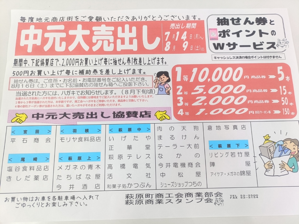 お知らせNEWS HOME> お知らせ一覧> お知らせ詳細 中元大売出しスタート!! いつもありがとうございます。 萩原スタンプ会の『中元大売出し』開催中です。 今年も10,000円~1,000円の商品券が220本当たります!! お買い上げ・2,000円毎に抽選券 ・500円毎に補助券を進呈いたします。 ※セール品、特価品など除外品がございます このチャンスをお見逃しなく!! 皆様のご来店をお待ちしております。 お知らせ一覧に戻る>>